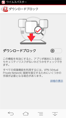 見分けるのが難しい不正アプリのダウンロード時にリアルタイムでチェックし、端末にインストールされるのを防ぐことができます。 また、モバイル端末でのインターネット利用時、Webサイトの安全性を判定し、ウイルス、スパイウェア、不正アプリの配布元サイト、フィッシングサイト、さらには、不正アプリの情報送信先サイトなどの不正なWebサイトへのアクセスをブロックします※2。また、迷惑電話や迷惑SMS(ショートメッセージ)の着信を拒否することもできます※3。