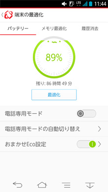 「電話専用モード」など、バッテリー消費量を抑えるための設定が簡単に自動でできる機能や、メモリの最適化、ブラウザ履歴やアプリストア検索履歴の消去機能がご利用いただけます※。